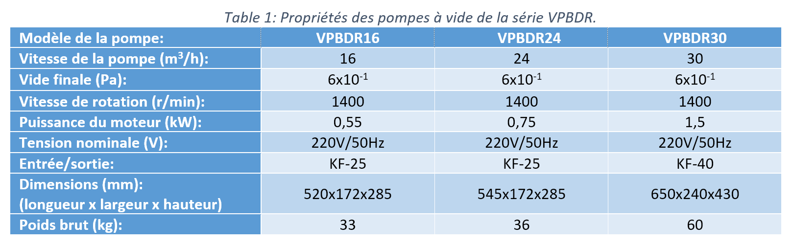 Le tableau mentionné présente les principales caractéristiques (propriétés) de ces trois modèles de pompes à vide industrielles disponibles dans notre boutique.